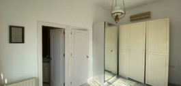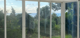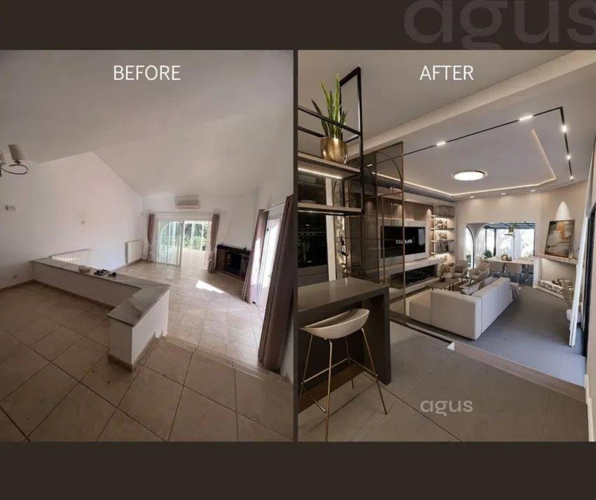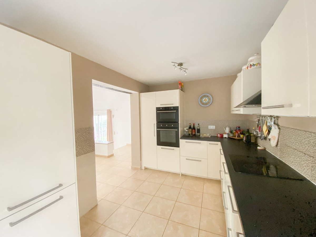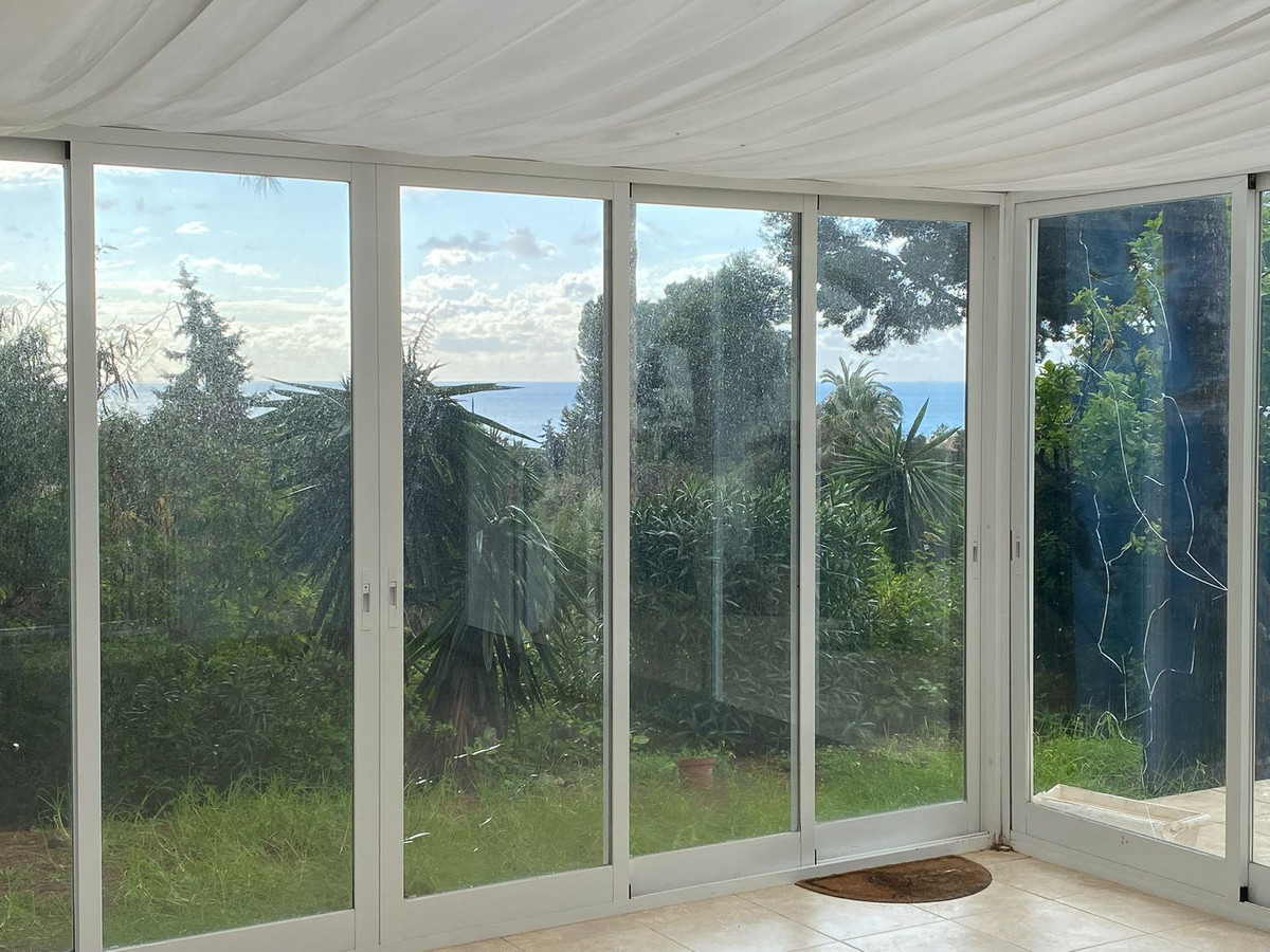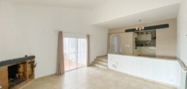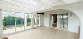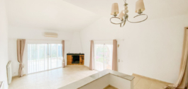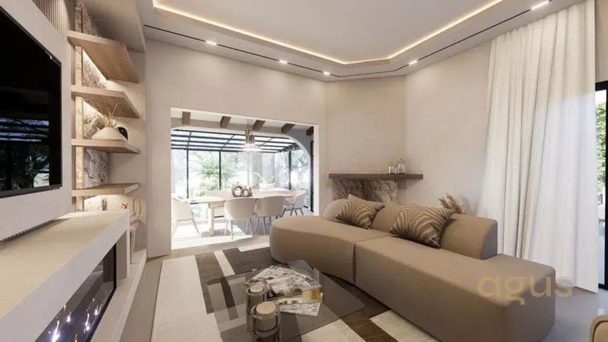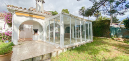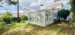 The property features a classic design with a spacious living room distributed on two levels and a separate kitchen. It currently has three bedrooms, all with en-suite bathrooms, and enough space to add a fourth bedroom after a renovation. Spacious terraces and a winter garden bring natural light and versatility to the living space, while the living room, with its cozy fireplace, is perfect for cooler evenings. The master bedroom is located upstairs and has a spacious bathroom and a private terrace. The entire house is equipped with air conditioning for added comfort.