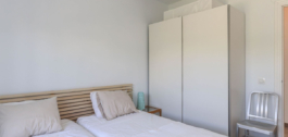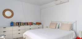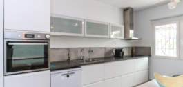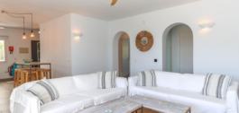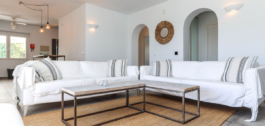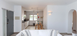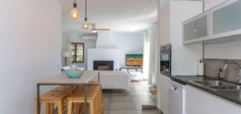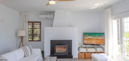 Inside, the villa feels refreshingly cool and inviting. The lounge centers around a striking fireplace, adding a cozy touch for winter evenings. The open-plan kitchen seamlessly connects to the living area and extends out to a covered dining terrace, perfectly positioned to overlook the pool.