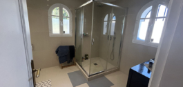 On the upper floor you find the main bedroom with a large bathroom with underfloor heating and a terrace with pergola from where you have lovely sea views.