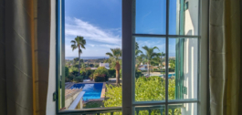 The villa comprises 3 spacious bedrooms, each with its own ensuite bathroom, plus a guest toilet. The ground floor features a large lounge with fireplace and dining area, a separate fully fitted kitchen, and a charming glassed-in west-facing dining patio perfect for enjoying sunsets all year round. From the lounge and covered terrace, the elevated position allows uninterrupted views over the pool and gardens.