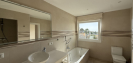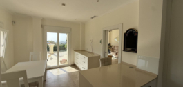 The large living room of approximately 50M2 has an open fire place, fully air-conditioned hot and cold throughout the house, large kitchen diner with a utility room, from the living room and kitchen you can access the wrap around terrace, and part of the terrace has been covered to give shade in the summer time. Again, you have sea views from the living room and terrace.