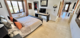 Taking the elegant stairway to the first floor landing which has 2 terrace areas to the rear overlooking front line golf and distant sea views. The first floor has an incredible Main Master Bedroom with private hallway offering lots of wardrobe space and a large ensuite Bath / Shower room. It also has its own enormous terrace with panoramic views over the swimming pool, golf, country and mountains. On this level you also have another Master Bedroom with ensuite Bathroom and own terrace overlooking front line golf.