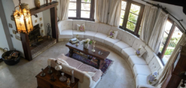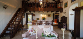 Inside, the villa showcases classic Spanish craftsmanship, with exposed wooden beams, intricate detailing, and a grand living room with vaulted ceilings and a cozy fireplace. Large windows and multiple terraces fill the home with natural light, creating a seamless connection between indoor and outdoor spaces.