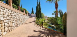 Electric gate and stairs down, also a slopping drive with electric gate. No obstructed views to the front over sweeping nature countryside. (Green land). Mature gardens with several Palm trees in various areas with another raised terrace and seating area that sweeps around the house to the driveway.