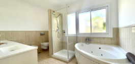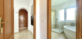 On the top floor, you will find three double bedrooms and two bathrooms. The impressive master is en-suite and located at the back of the villa. This generously sized room boasts expansive patio doors that lead out to a private terrace with breathtaking views of the countryside. It's the ideal spot to enjoy morning coffee or unwind with an evening glass of wine while taking in picturesque sunsets. The master bedroom also features a wealth of built-in wardrobes, ensuring plenty of storage space. Its en-suite bathroom is luxurious, equipped with a double sink unit, a walk-in shower, and a corner jacuzzi bath, adding to the overall comfort and opulence of the living space.