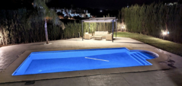 The flat plot is easy to maintain and features a collection of mature trees and plants. The recently renovated saltwater pool is bordered with new tiles, providing ample space for relaxation and entertainment. There is plenty of room for sunbeds and loungers on the grassy areas, a pergola offering shade, and a designated BBQ zone for cooking enthusiasts. The exterior space is fitted with automated outdoor lighting, enhancing the ambiance. A conifer hedge surrounds the garden, ensuring privacy, while trimmed trees at the rear unveil captivating views of the protected land and the vast countryside beyond.