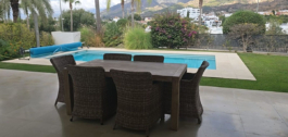 This luxurious modern villa is located in the residential community of Río Real "La Finca de Marbella", 15 minutes walk from the beach ("Trocadero Arena" restaurant), 5 minutes by car from the center of Marbella and 15 minutes from Puerto Banús. The 3-bedroom villa is made up of two levels, 2 bedrooms on the second floor with a large terrace with spectacular mountain-, city- and partly sea views and 1 bedroom on the ground floor. Each room is equipped with elegant furniture and a private bathroom. The ground floor offers a large living and dining area connected to the open plan kitchen. The floor-to-ceiling windows allow the interior and exterior areas to be integrated, making it especially pleasant. The villa has its own private heated pool, closed private parking for 2 cars and tropical plants throughout the garden. Underfloor heating, air conditioning, alarm system and cameras, all for the comfort of living.