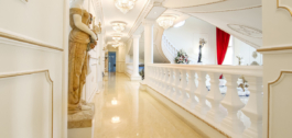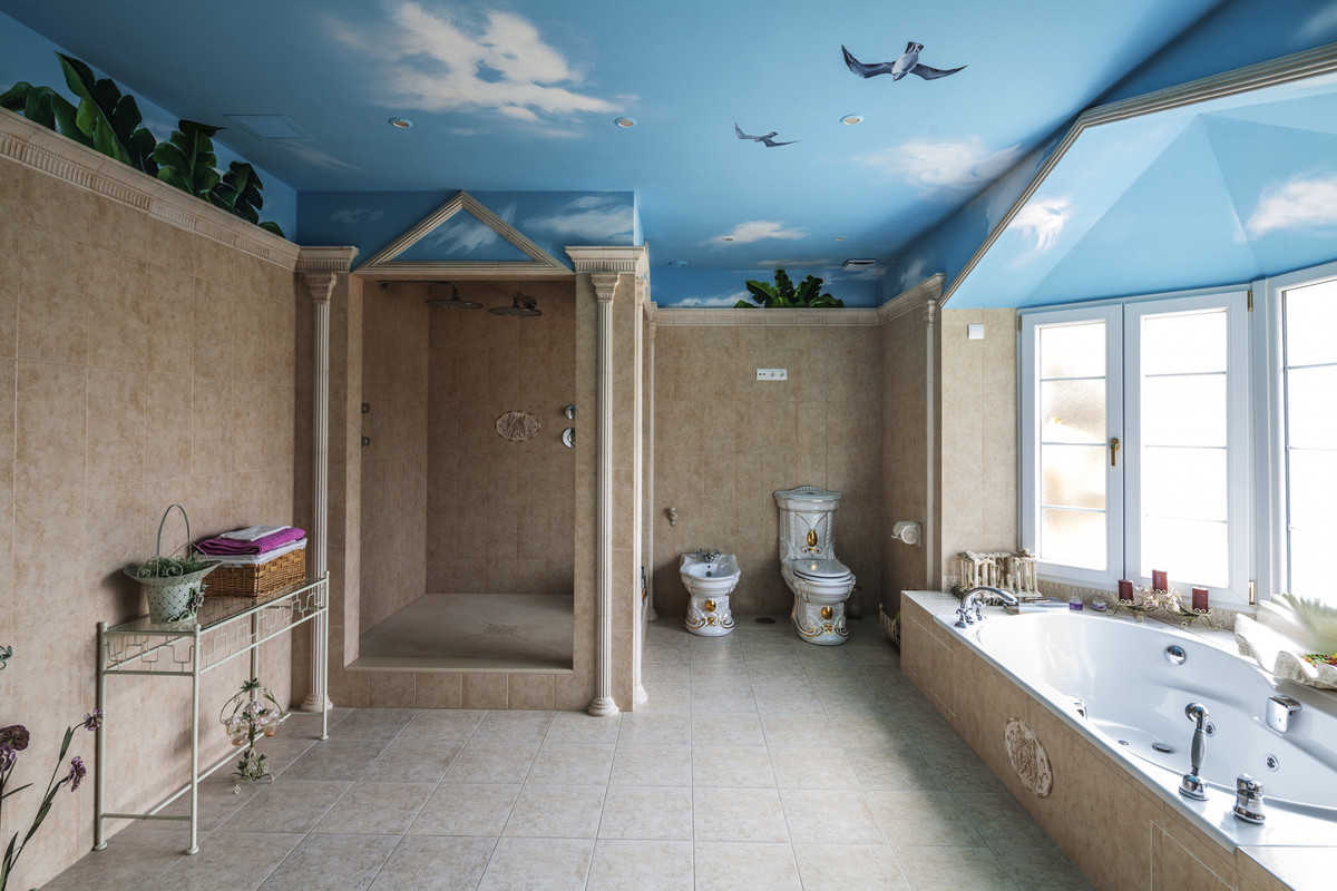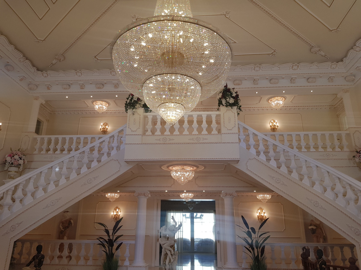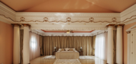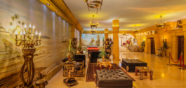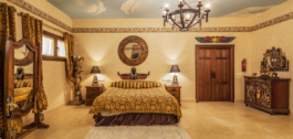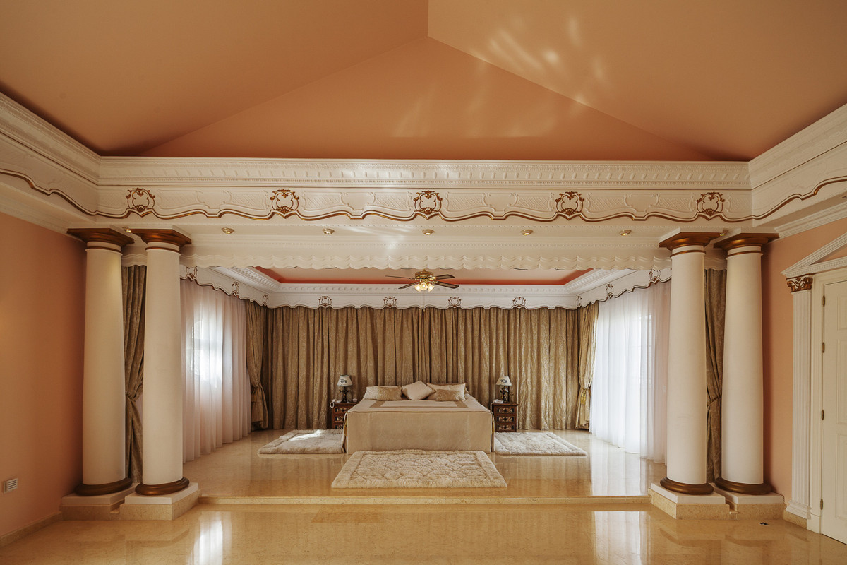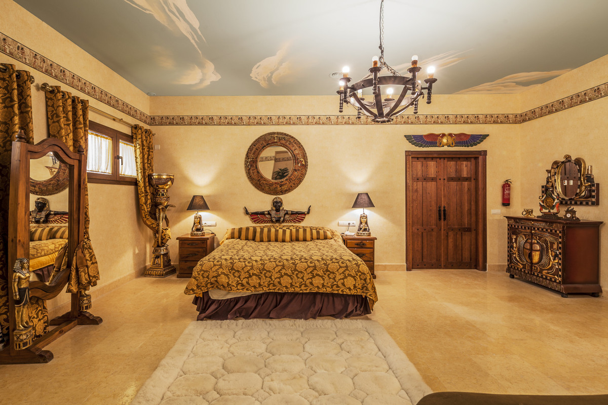 The semi basement homes the most exquisite entertainment area with hand painted murals and golden ornate statues decorating the Egyptian lounge and cocktail bar. On this level you also have a further two guest suites, decorated in fitting with the ancient Egyptian theme and a modern gymnasium.