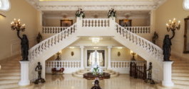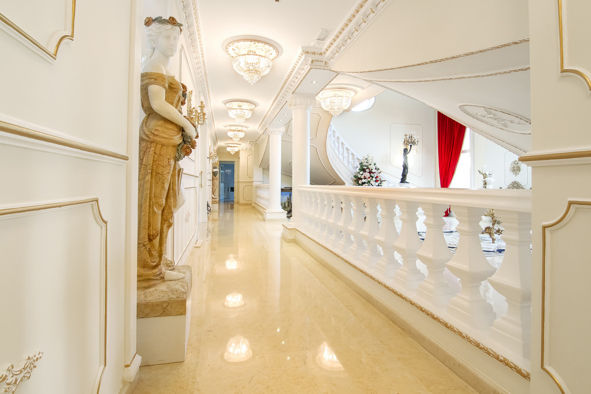 A grand entrance hall with a spectacular curved marble staircase leads you to the upper level, also accessible by the lift. The upper level has two bedrooms, where you will find the master suite with living area and dressing room, with detailed hand painted finishes on walls and ceilings. The fixtures and fittings throughout this home are of the highest qualities