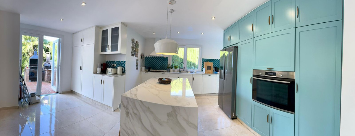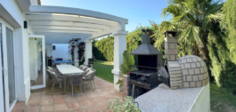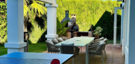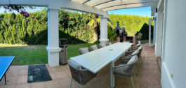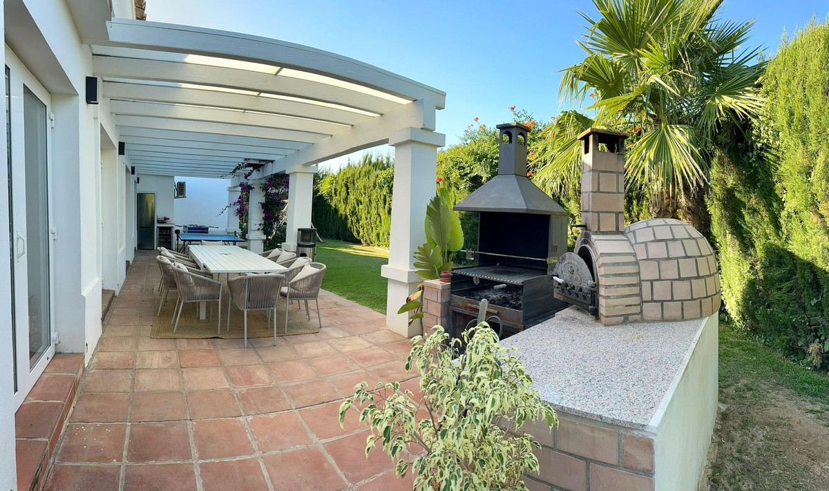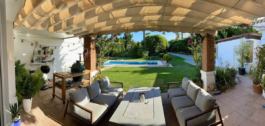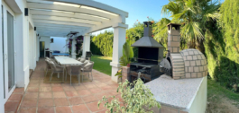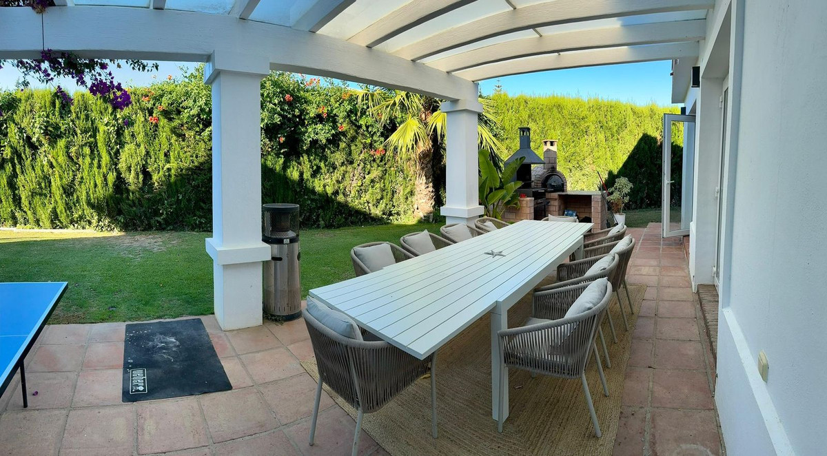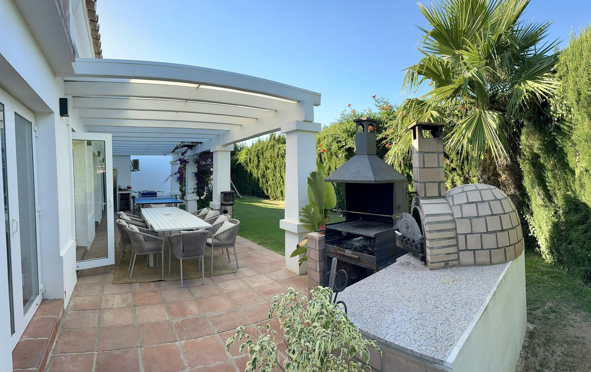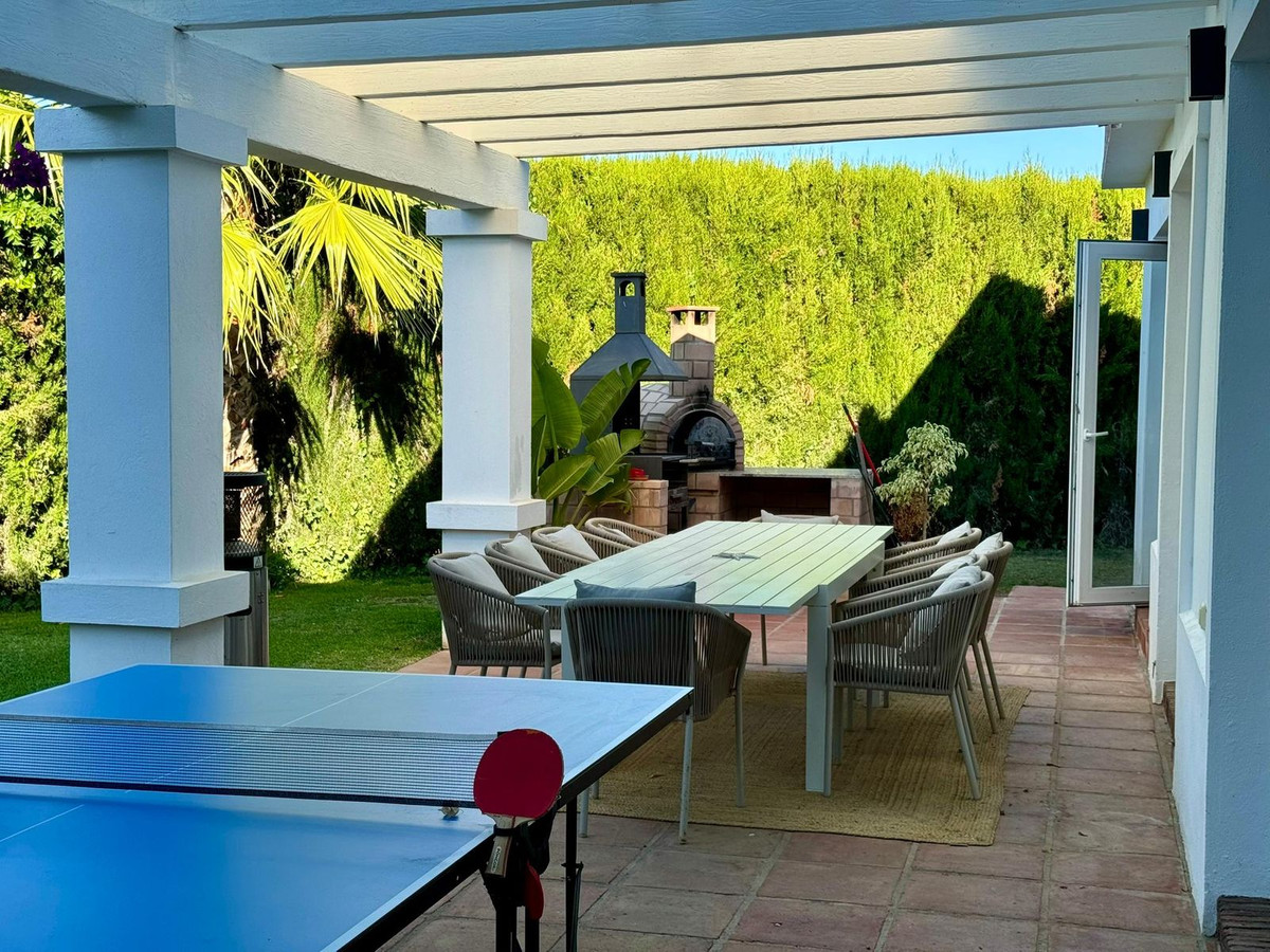 Fabulous family home in the exclusive area of Sotogrande. This 5 bed villa is located on the beachside of the main A7 road and close to a number or shops and amenities, as well as the beach and marina of Sotogrande. The property has a lovely entrance and drive way, leading to a private garage and to the front of the house, which faces the well maintained pool and garden. There are various outdoor living areas, where you can enjoy all day sunshine, or find some much needed shade in the hot summer months. There are chill out areas, dining areas and a superb spot for BBQ and an outdoor pizza oven. The villa is exceptionally well priced and is perfect for either a holiday home, or permanent family residence.