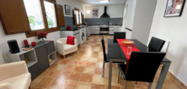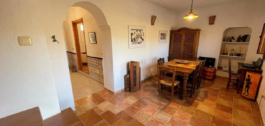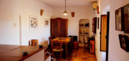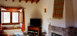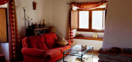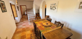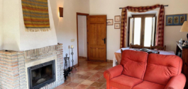 From the hallway, we enter the dining room with beautiful views of the mountains. Adjacent is the spacious living room. This living room has a beautiful wooden ceiling, French doors to a terrace and a beautiful wood-burning stove.
