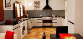 The kitchen is very spacious and modern. It is tastefully decorated, has a particularly spacious worktop and is equipped with all the necessary built-in appliances. The tiling and colour scheme are modern and provide a nice contrast to the characteristic building. Opposite the kitchen is a cloakroom and a guest toilet with a small shower.