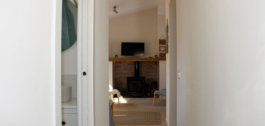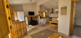 When you step into the house, you are greeted by a modern kitchen to the right, leading to a cozy living room with a fireplace. The house has two bedrooms and a bathroom, all recently renovated to meet modern standards of comfort and style. Large windows let in plenty of natural light, creating a bright and inviting atmosphere.