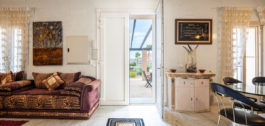 Inside, the finca features bright open living spaces with tall windows that fill the rooms with natural light. The main living area connects seamlessly to the dining space and a modern kitchen designed for entertaining. Three spacious bedrooms on the main floor and a peaceful master suite upstairs offer comfort and privacy. A rooftop terrace, private courtyard, and multiple outdoor dining areas make this home ideal for relaxed Mediterranean living.