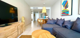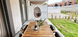 The apartment is equipped with a living room with access to the terrace and garden with a dining room and an open fully equipped kitchen and utility room, where there is a washing machine and dryer.