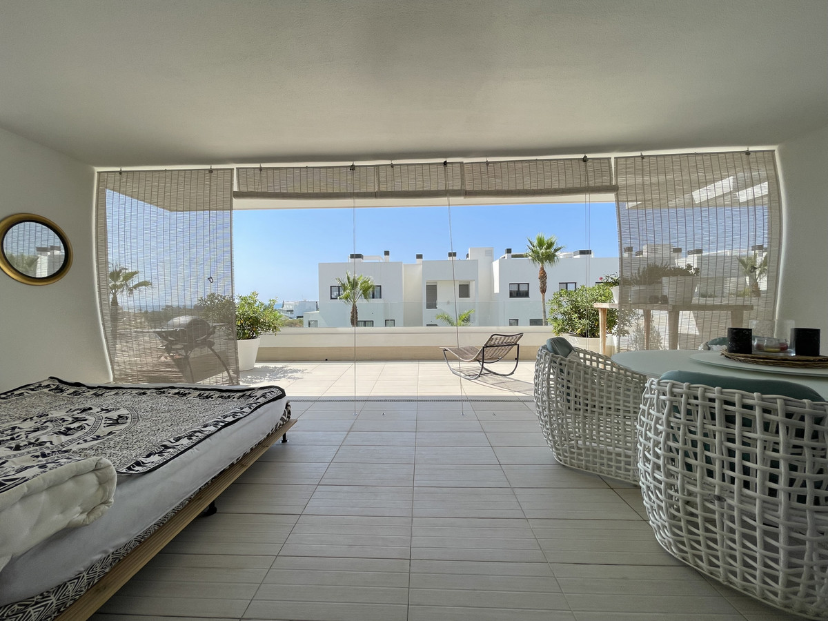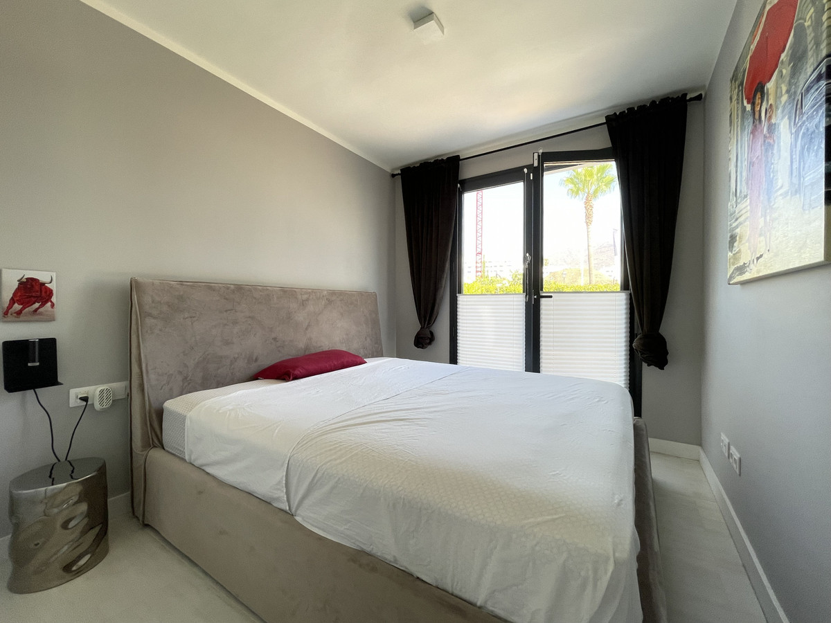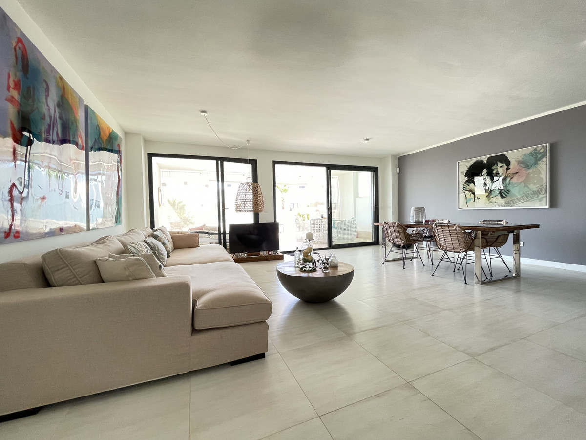 We present this exceptional ground floor apartment located in the sought-after area of Las Olas, in West Estepona. The property, with a built area of 182m² and 90m² of interior space, stands out for its transformation from the original three bedrooms to a modern two-bedroom design, allowing you to enjoy a 30m² living room, providing greater space and comfort to the living area.