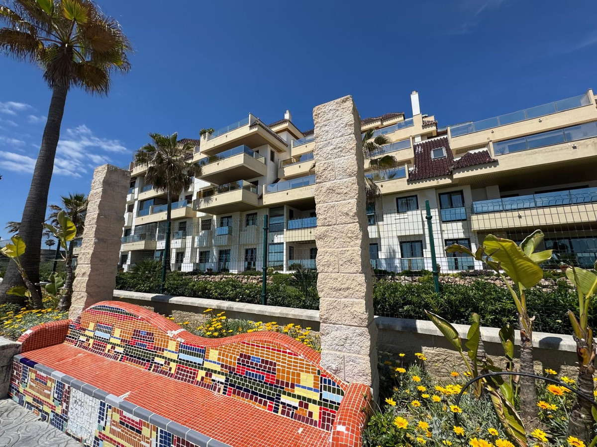 Magnificent 3 bedroom ground floor flat in the beautiful urbanisation of Marina Castillo, on the beachfront. A very nice flat, good qualities, with air conditioning hot/cold and home automation. The kitchen is independent with a small laundry room, we have 3 bedrooms with electric blinds and 2 complete bathrooms with electric towel rails, one en suite. The living-dining room, as well as the kitchen and 2 bedrooms have access to the large terrace of almost 70m2. The terrace is closed with glass curtains that allow you to enjoy your stay all day long and its corner location lets the sun in the morning until 13h but recovers it in the afternoon, a real pleasure. A quiet location, close to a rest area and with easy access to the communal swimming pool. The views are nice, some sea, garden and small Andalusian villaje complex….