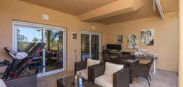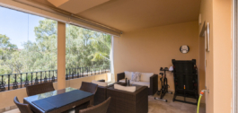The Lounge is vast and has adequate room for dining. Glass sliding doors lead onto a South facing terrace overlooking a lake and shrub land. There are Automatic shutter blinds for the windows with the added benefit of glass folding curtains to enclose the terrace, this area is very spacious and very comfortably has enough space for lounging furniture and dining furniture.