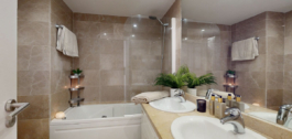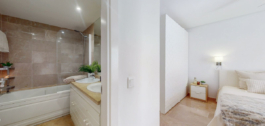 En-suite bathroom with double sink, WC, shower, and bathtub, as well as a washing machine and a dryer machine.