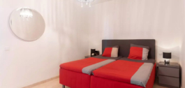 It includes two generous bedrooms: one with an en-suite bathroom, and a second bedroom with two single beds and an adjacent bathroom.