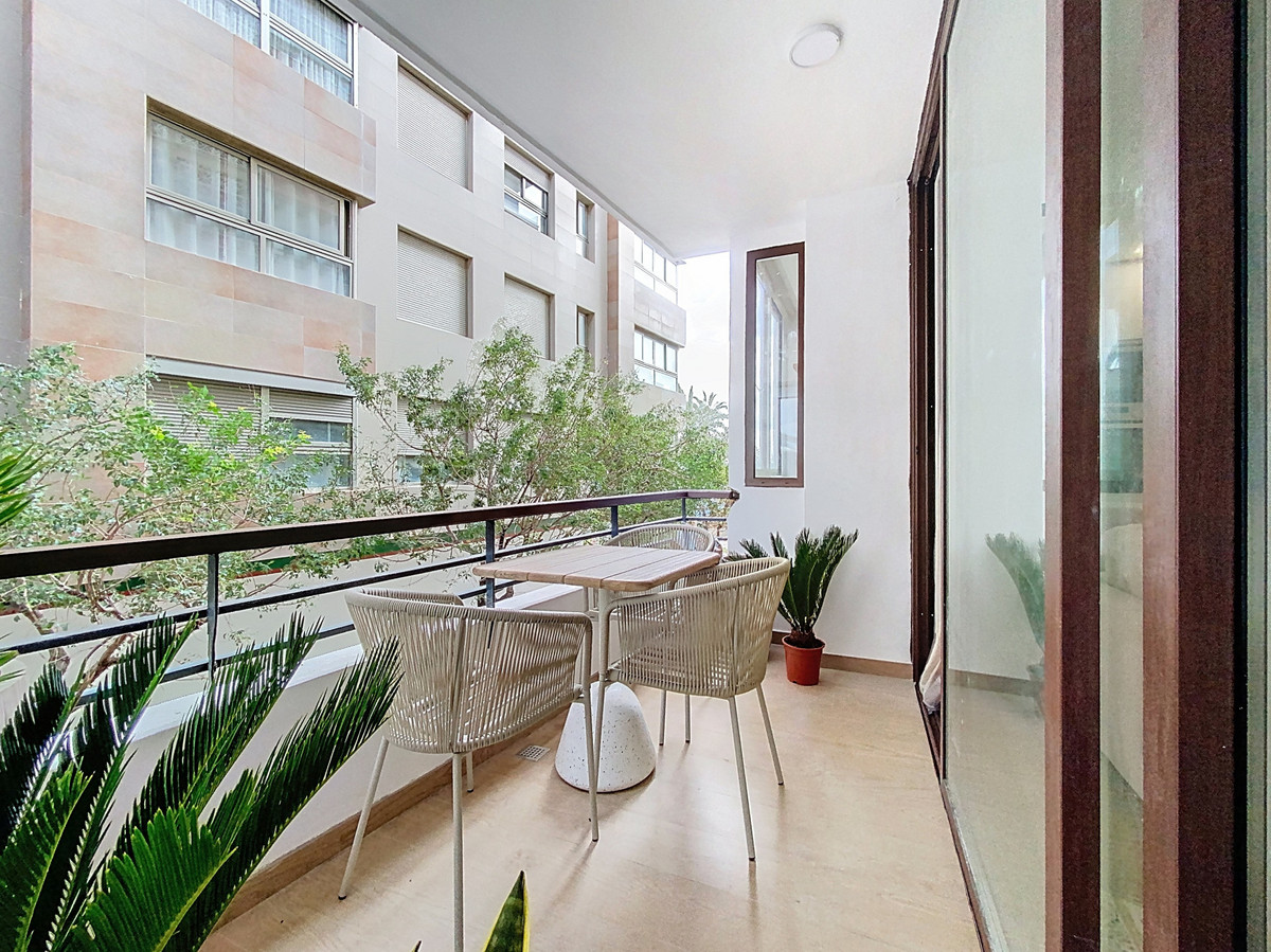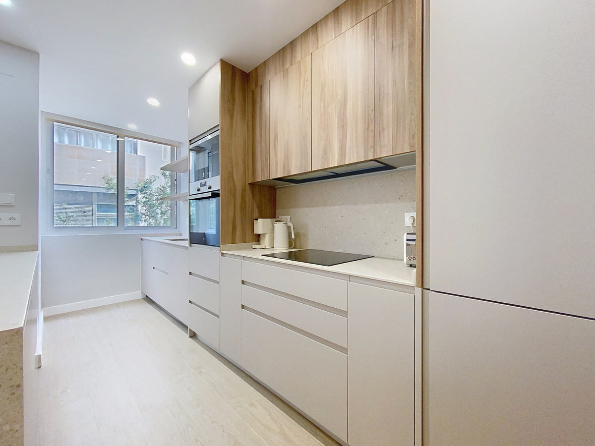 The main area of the property consists of an open-plan living room with an integrated dining area, providing a spacious and bright atmosphere. The parquet flooring and large windows with glass doors add warmth and light to the space. The kitchen, fully equipped and designed in an open-plan style with a peninsula, is integrated into the social area, facilitating interaction and optimal use of space. From the living room, there is access to a balcony-style terrace of approximately 7m², ideal for enjoying the side sea views and the Costa del Sol climate.