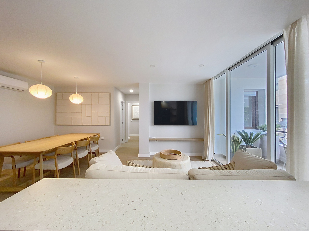 The apartment features two bedrooms, both with built-in wardrobes and modern finishes. The master bedroom has a large private bathroom with a spacious shower, while the second bathroom is also fully equipped and maintains the same contemporary design. Finishes include porcelain flooring in wet areas and double glazing on all windows, ensuring comfort and efficiency.