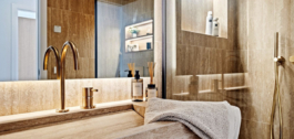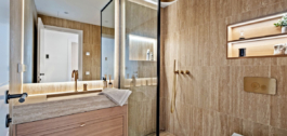 Two spacious bedrooms and two luxuriously appointed bathrooms, both featuring rain showers, floating vanities, and suspended toilets