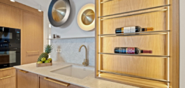 A fully customized designer kitchen with rounded-edge carpentry, indirect LED lighting, and a built-in open wine display — merging natural textures with contemporary function