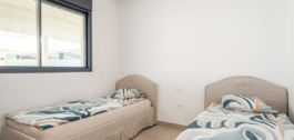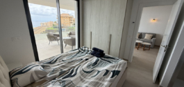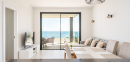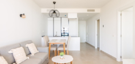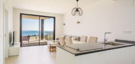 The apartment features a bright open-plan living and dining area with direct access to a spacious terrace showcasing panoramic views of the Mediterranean. The contemporary kitchen is fully equipped, and both bedrooms are generously sized, with the master suite offering an en-suite bathroom and built-in wardrobes. The finishes are of high quality throughout, making this a move-in-ready home.
