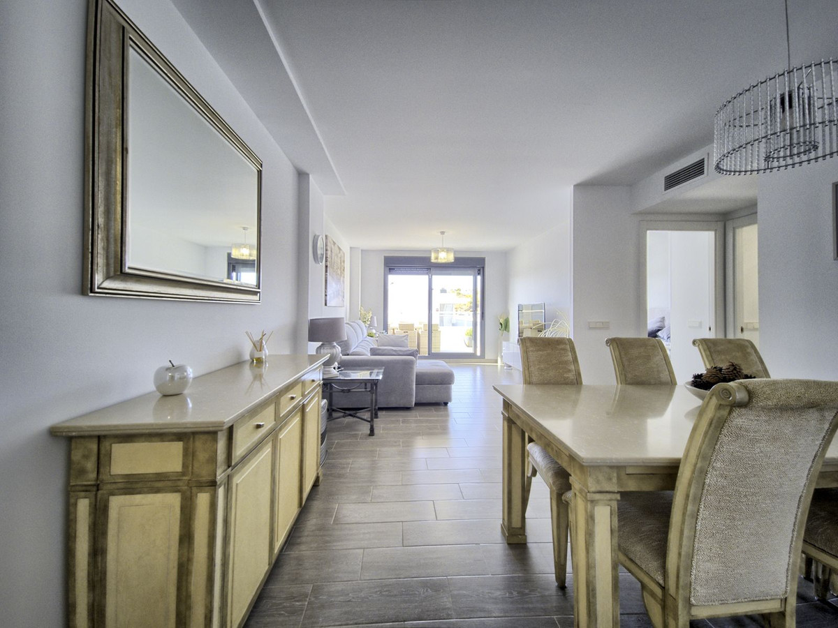 Step inside to discover a spacious and bright living/dining area, designed for both comfort and entertaining. Large sliding doors open out to a generous south-west facing terrace that enjoys sunshine all day long — the ideal space for al fresco dining, relaxing, and soaking up the Mediterranean sun, with extendable awnings providing shade when needed.