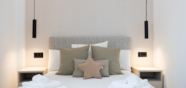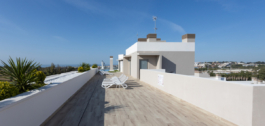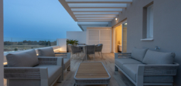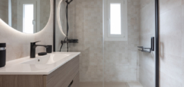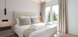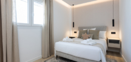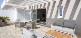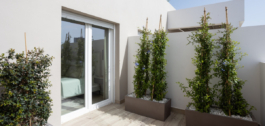 Both bedrooms open to a wide terrace that is also accessible from the living room. The master bedroom has an ensuite bathroom with a walk-in shower, while the second bedroom sits beside a modern guest bathroom. Clean design and neutral tones create a calm and welcoming atmosphere.