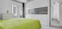 The master bedroom is generous in size and features an en-suite bathroom with double sink and walk-in shower, as well as three built-in wardrobes and access to the main terrace. The second bedroom, with white lacquered built-in wardrobes and a private balcony, is located next to a modern renovated bathroom with shower.