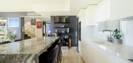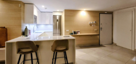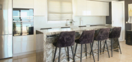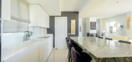A semi-private elevator takes us to this fantastic penthouse. On the first level, we find a bright and spacious open-plan living area, with raised ceilings that give this particular apartment a feeling of openness as you walk in. This duplex has beautiful Porcelanosa flooring throughout, and a well-equipped kitchen that features a gorgeous quartzite countertop island, perfect for entertaining or enjoying a relaxing brunch. A pretty view of the hills can be enjoyed from the window over the sink. All ceiling lights throughout the house are energy-efficient and dimmable, for an easy change in ambiance depending on the occasion.