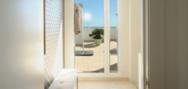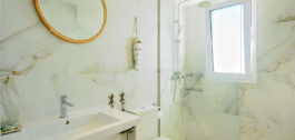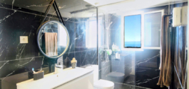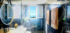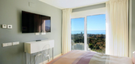 A sophisticated modern stairway with a large window (offering sea views) leads us upstairs to the master bedroom, a luxe and inviting space where one can enjoy spectacular views of the sea and coastline while lounging in bed. On a clear day, the outline of the African mountain range can be seen, along with Gibraltar and the nearby Sierra Blanca mountain range. The room comes with ample built-in closets. The ensuite bathroom is done in black slabs with white veining, which, juxtaposed with the white sink and cabinetry, makes it simply stunning!! On that same level, we find a large second terrace, ideal for sunbathing, as it is entirely private, where one can enjoy a snack at the high table and, undoubtedly, the incredible 360º views. It comes equipped with an outdoor shower, a nice addition for a quick refresh while enjoying the summer sun.
