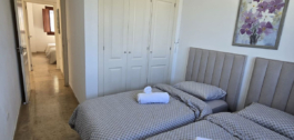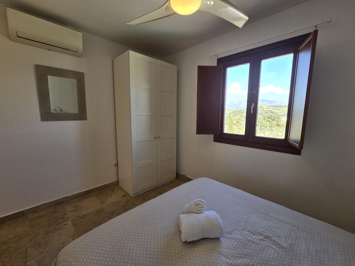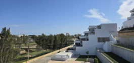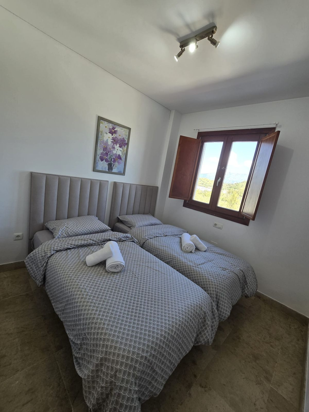The first floor consists of 3 bedrooms and two complete bathrooms (one en-suite), all the bedrooms have fitted wardrobes. Then on the ground floor we find a guest toilet, kitchen and living room, both rooms with direct access to a large terrace overlooking the sea, mountains, golf and one of the swimming pools (there are 2) of the urbanization. Southeast facing.
