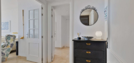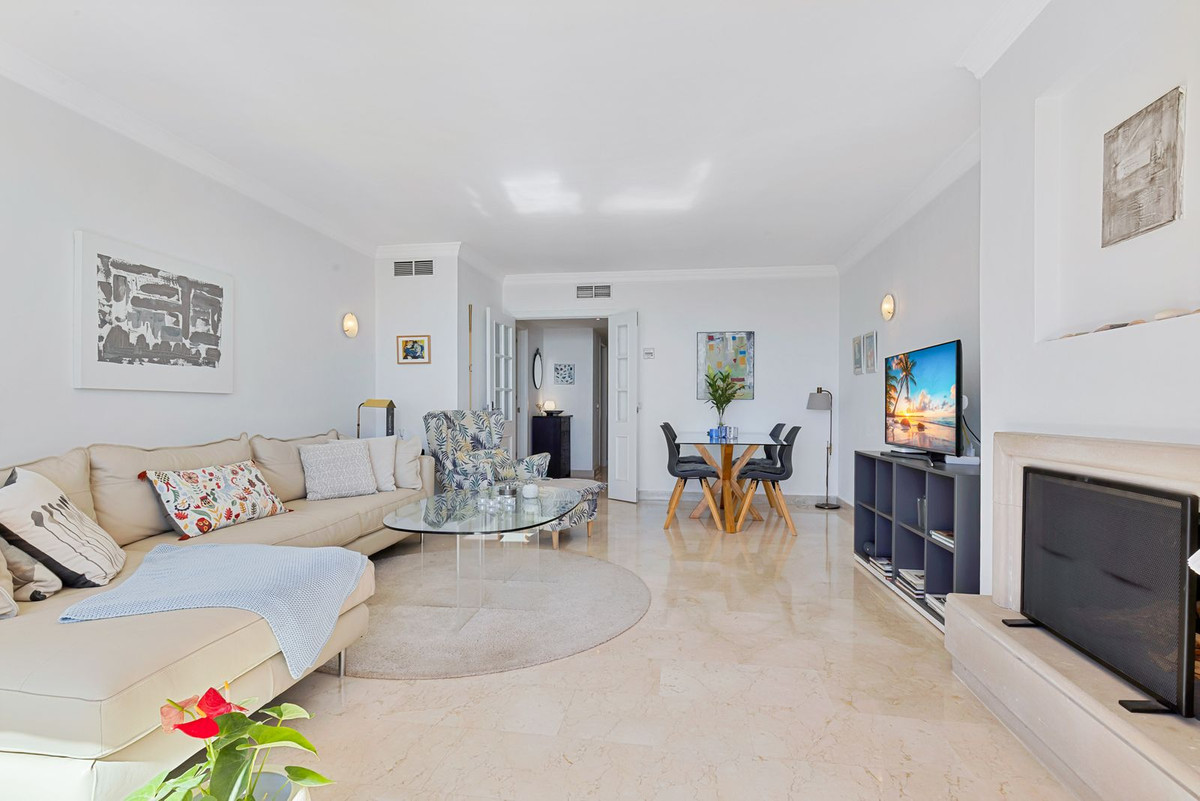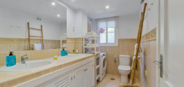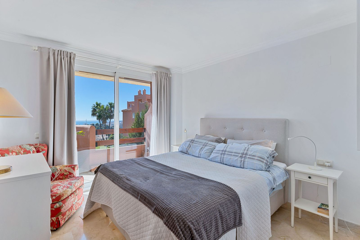 From the moment you step into the hall you are struck by the fantastic view and the natural light in the apartment. To the right there is a fully equipped kitchen with dining area and large windows overlooking the communal garden and one of the communal swimming pools. To the left there is the living room with fireplace and glass doors out onto the 22 m2 terrace with built-in sofa and space for a dining table, barbecue and plants. And did we mention that the terrace offers a fantastic view down to the sea and Fuengirola?!
