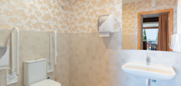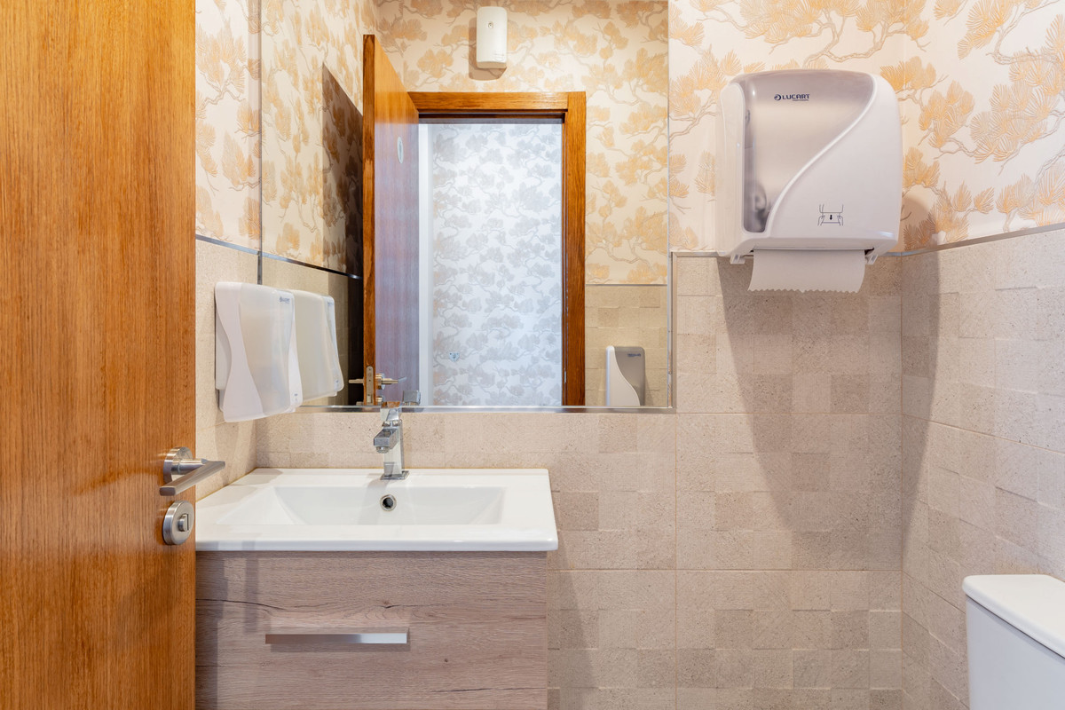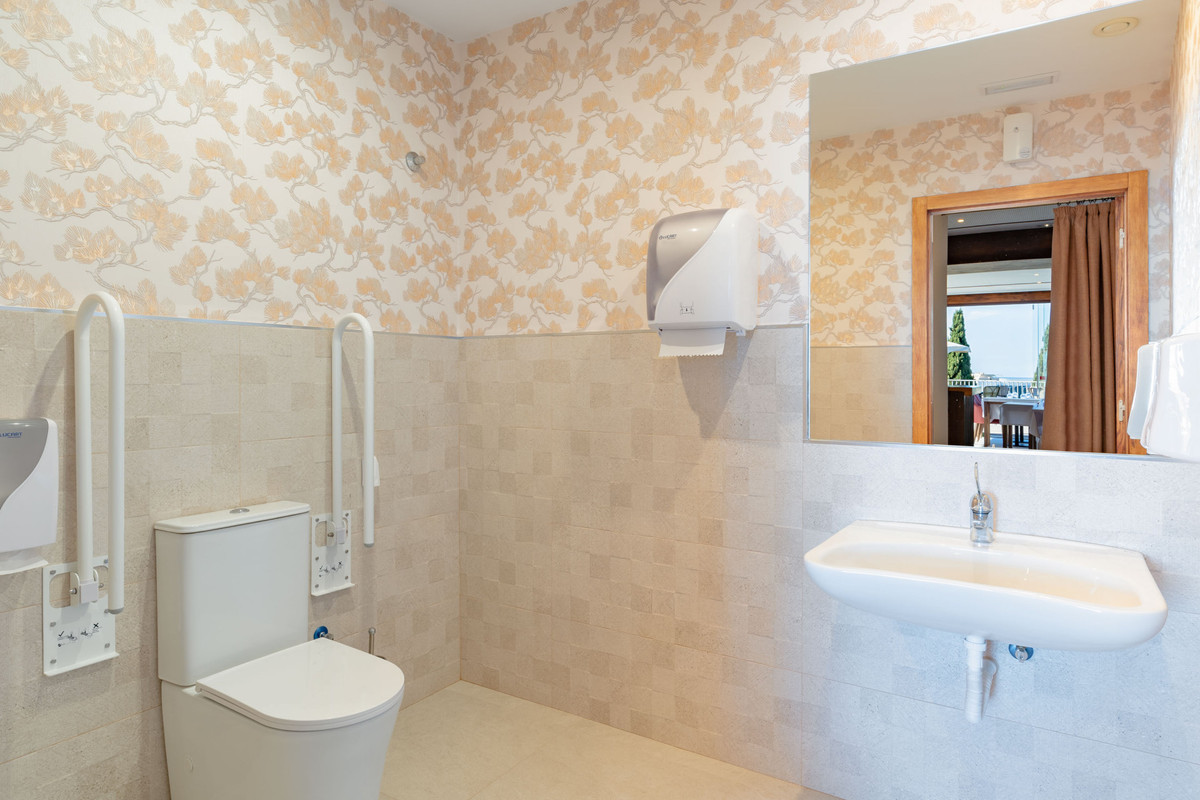 The furniture includes high-quality wooden tables. We are proud to be the only restaurant in the area with two bathrooms, one of which is adapted for people with disabilities. Our crockery and cutlery come from a renowned Portuguese brand known for its exceptional quality and craftsmanship.