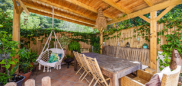 The home is surrounded by multiple outdoor spaces, each with its own charm—from a dining patio and lounge area to a barbecue corner and convenient storage areas. Solar panels add an eco-friendly touch, delivering energy efficiency and cost savings.