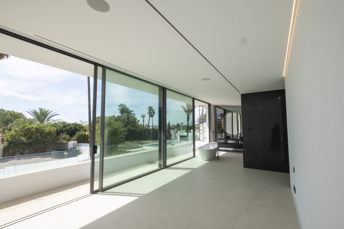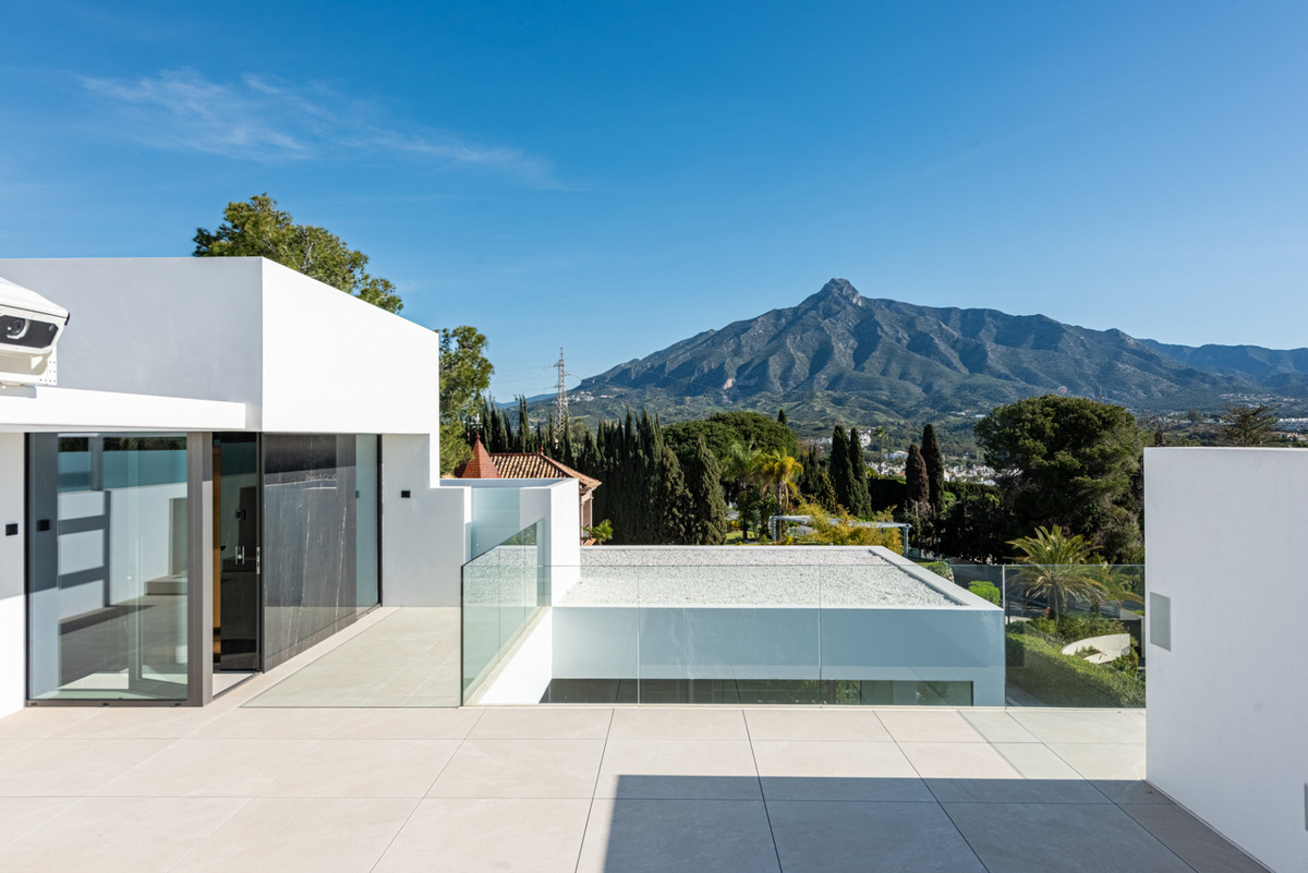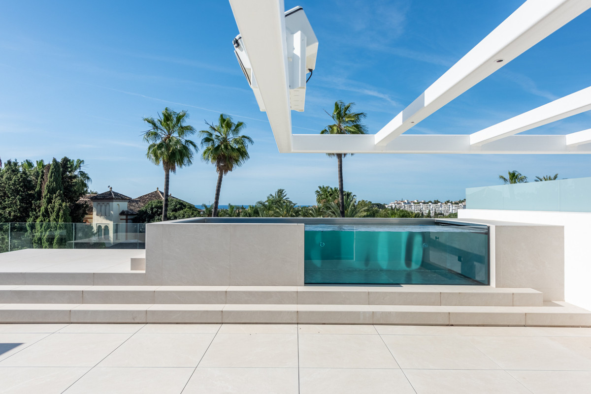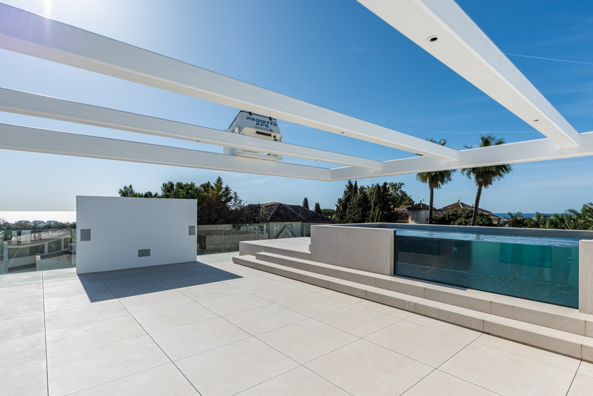 Set within beautifully landscaped gardens, the villa features a private pool and outdoor living area designed for relaxation and entertainment. Spacious terraces invite alfresco dining and sunbathing, while shaded pergolas provide the perfect setting for enjoying Marbella’s year-round sunshine in comfort.