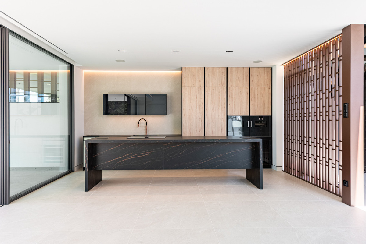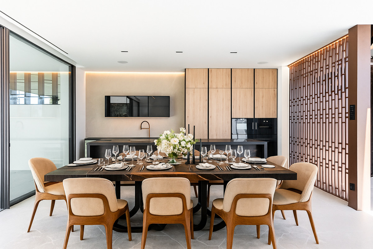 The open-plan living area flows effortlessly, combining living, dining, and kitchen spaces into a cohesive whole that exudes sophistication. The state-of-the-art kitchens are equipped with the latest appliances, featuring high-end materials such as marble countertops and custom cabinetry, along with Gaggenau appliances, that blend functionality with sleek design.