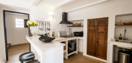 The spacious yet cozy living room is the warm heart of the house, featuring a fireplace and a fully equipped open kitchen with bar. The bright, modern bathroom offers every luxury with a stylish double sink vanity, a spacious walk-in shower, a semi-separate toilet, and a washing machine.